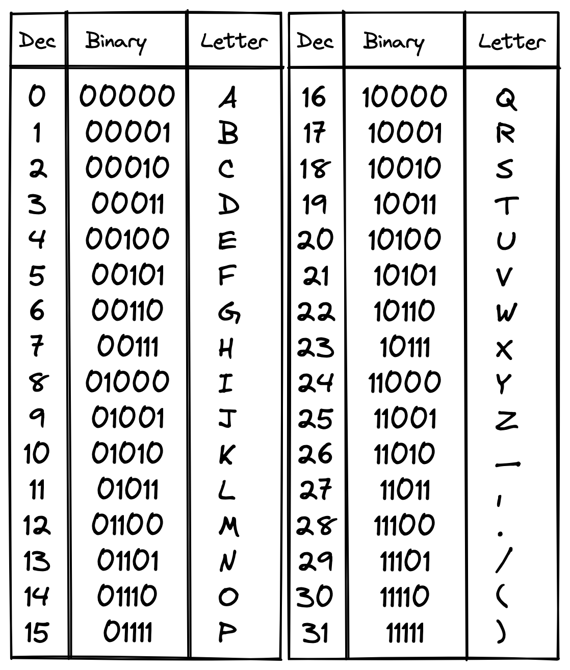 Circling back to the alphabet, we can see that since every letter in our alphabet can be represented by a series of 5 left or right directions, and since a left or right can be represented as a 0 or 1, every letter in our alphabet can be represented by a sequence of 5 binary digits. 5 bits. A is 00000, B is 00001, F is 00101 and so on. If you want to, you can take the time to work through cutting the alphabet in half and going to the left or the right each time you want to work out the letter. Or you can use this handy table.