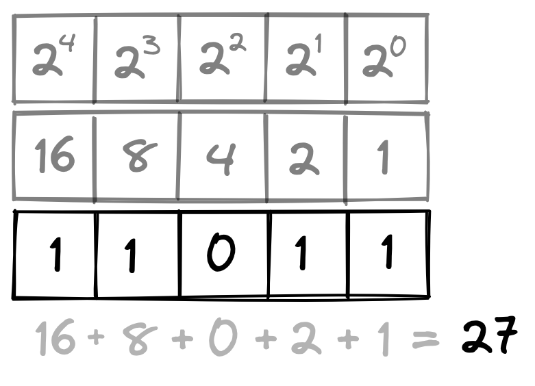 A 0 tells us that nothing should be added to the total for that position, and a 1 tells us that 1 of the place value should be added. In the example above, 11011, we add 1 of the ones place, 1 of twos place, 0 of the 4s place, 1 of the eights place and 1 of the sixteens place for a total value of 27. Each digit in the binary number system is called a bit (remember, a bit is also the amount of data needed to answer a yes or no question).
