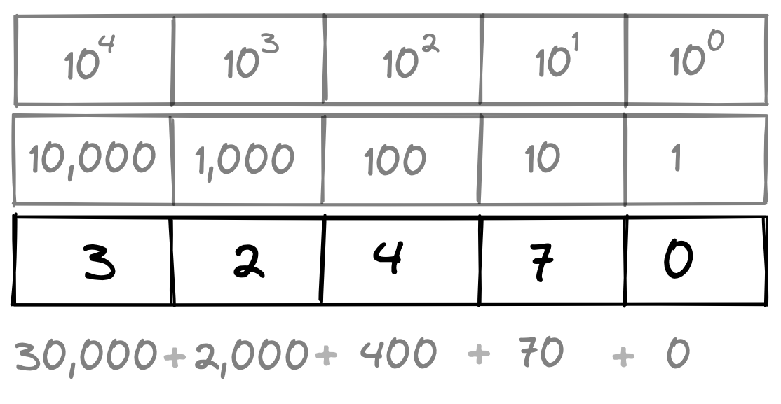 We can see that each place increases by 10 times as we move from right to left, and the number in each position tells us how many of each place to add to the total. In this case we add 0 ones, 7 tens, 4 hundreds, 2 thousands, and 3 ten-thousands to get 32,470.